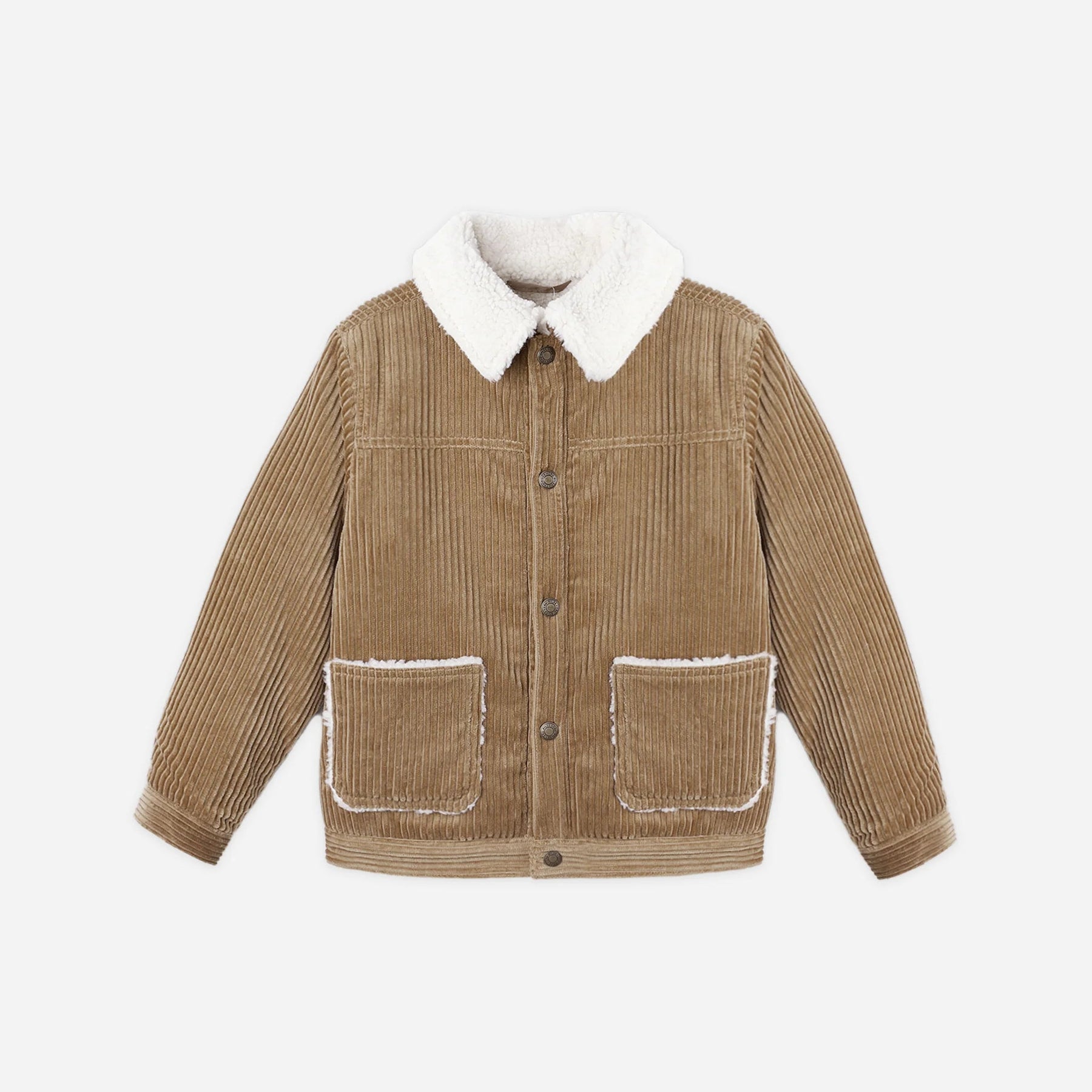 Our Corduroy Jacket brings warmth and classic style to chilly days. Designed with a cozy shearling collar, functional front pockets, and finished with brass shank buttons down the front.