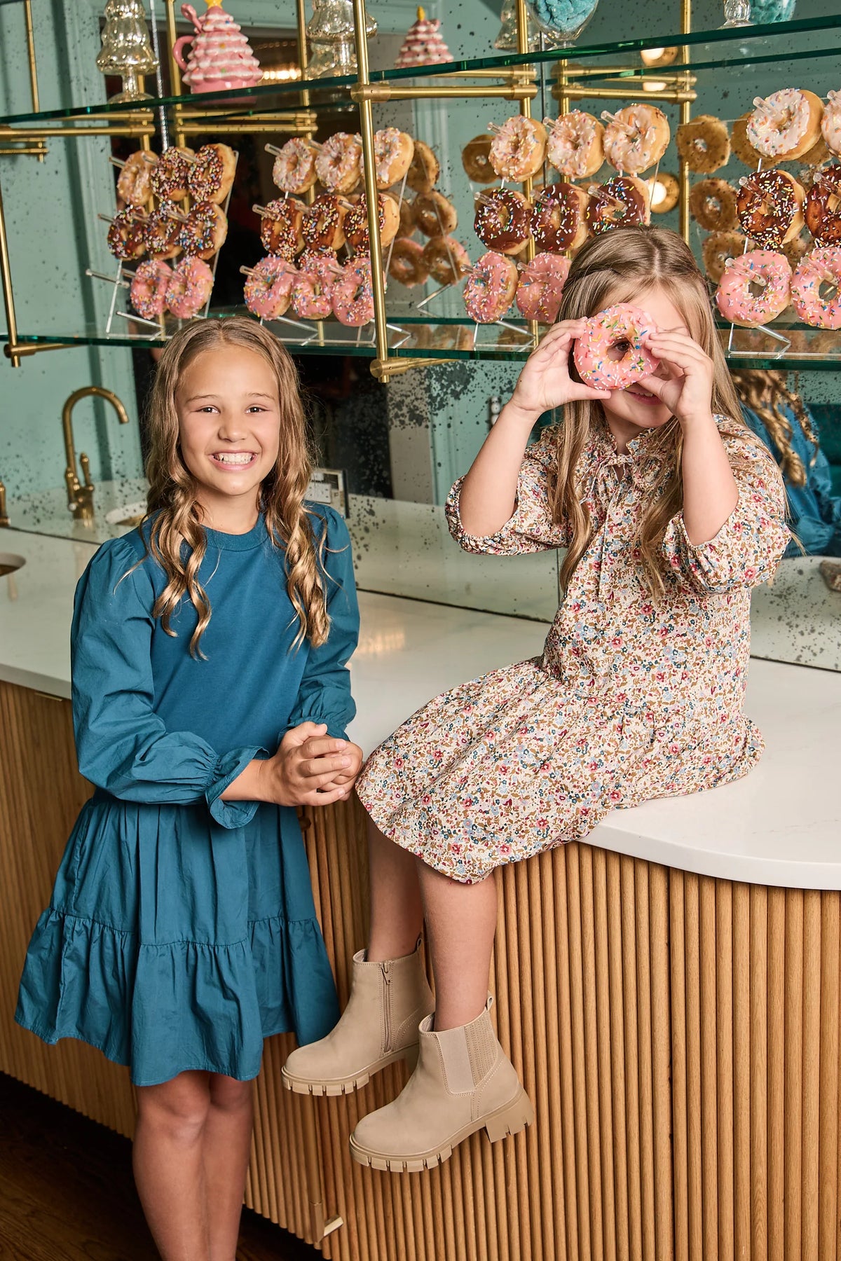 This combo dress is closet staple! Her sweatshirt bodice mixed with her poplin sleeves and skirt create an elevated look that's appropriate for school, church, holiday parties, or family photos.