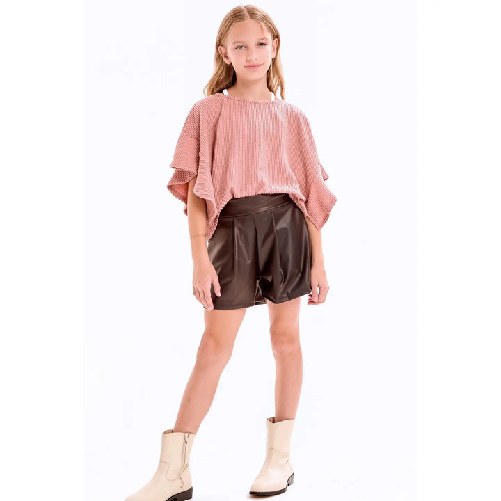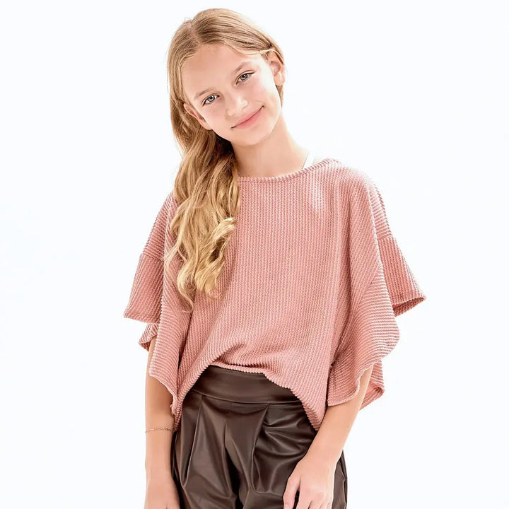 - Mid weight embossed texture rib knit fabric - Round neck and dropped shoulder - Ruffled sleeves - Cropped silhouette